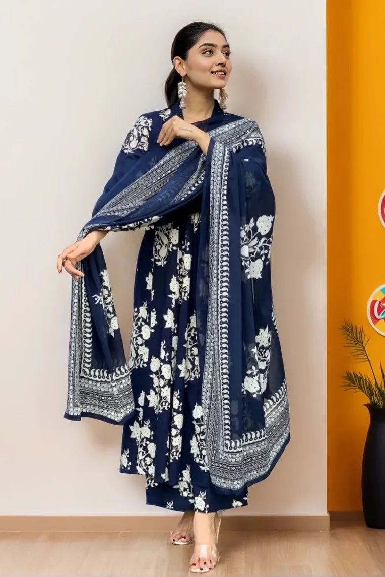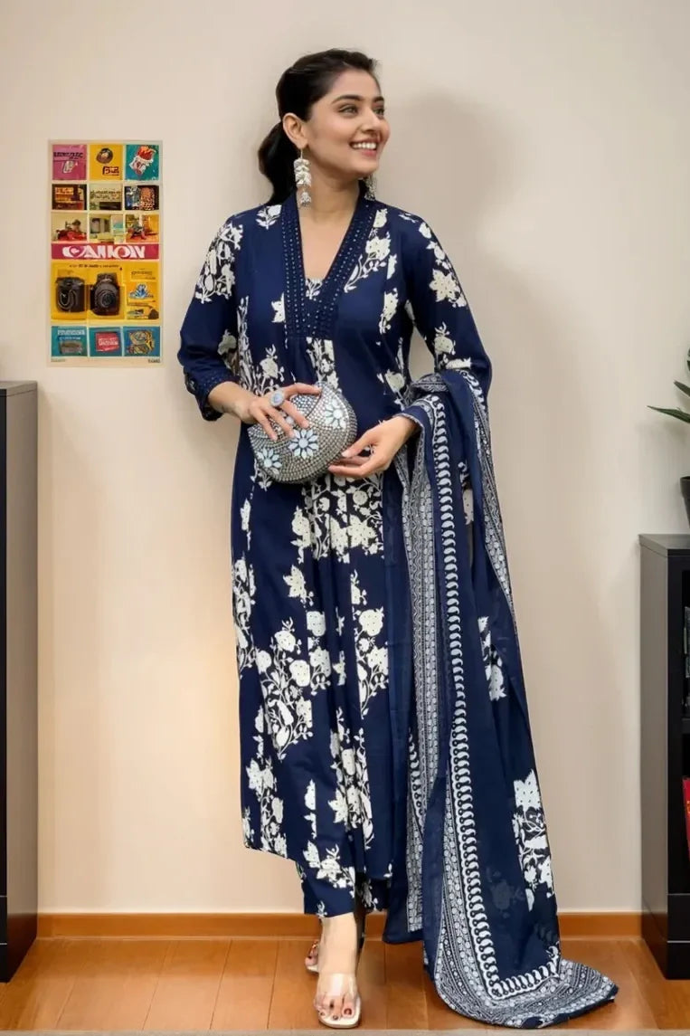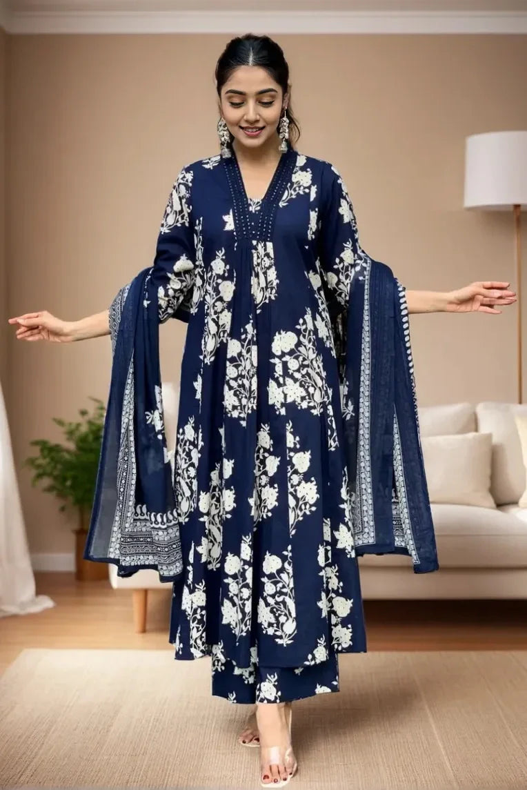 Ebbani Women’s Cotton Motifs Navy Blue A-Line Kurta Set with Dupatta