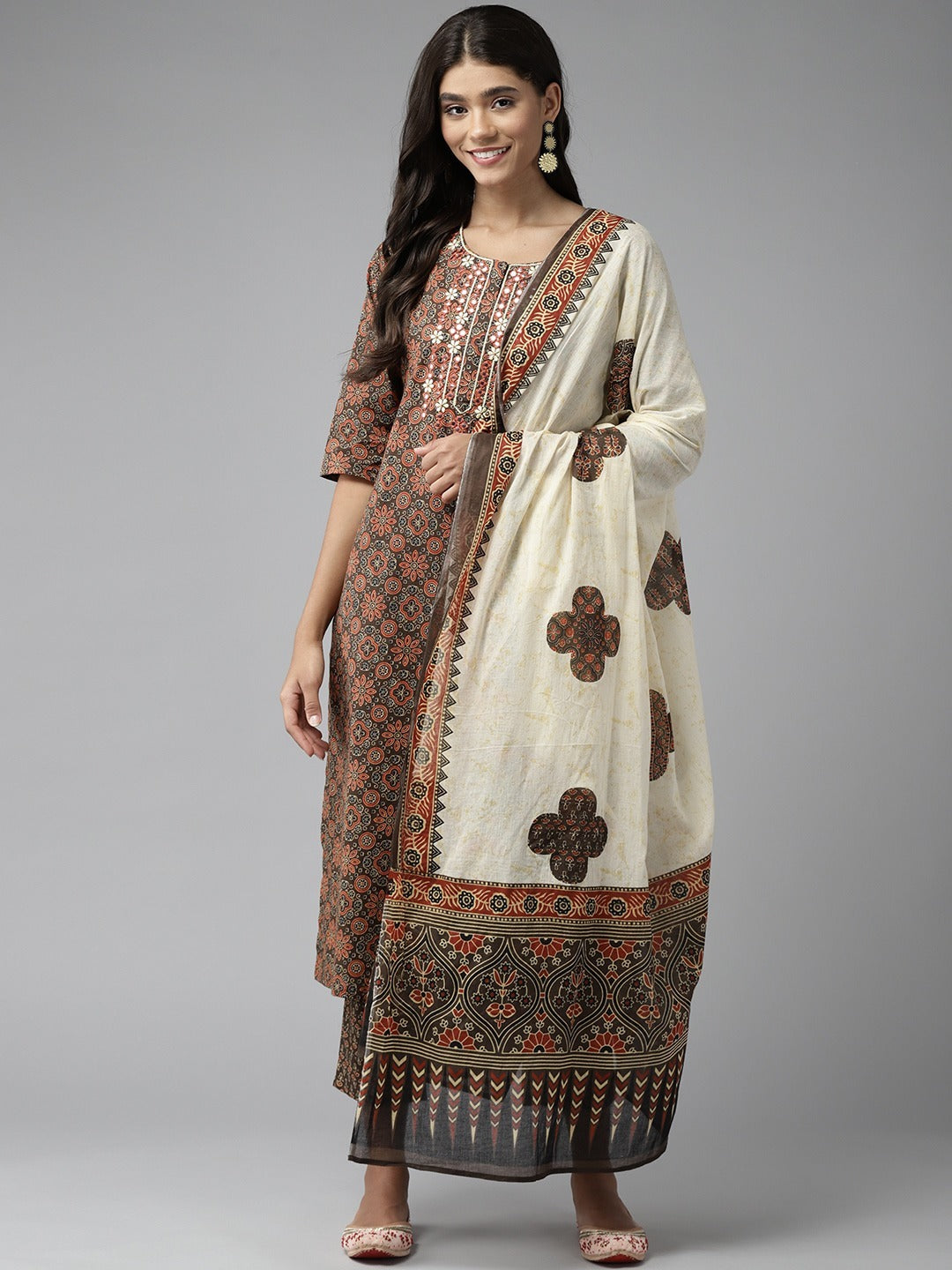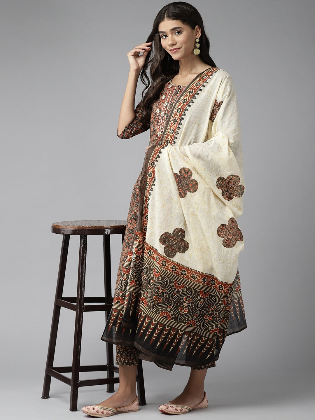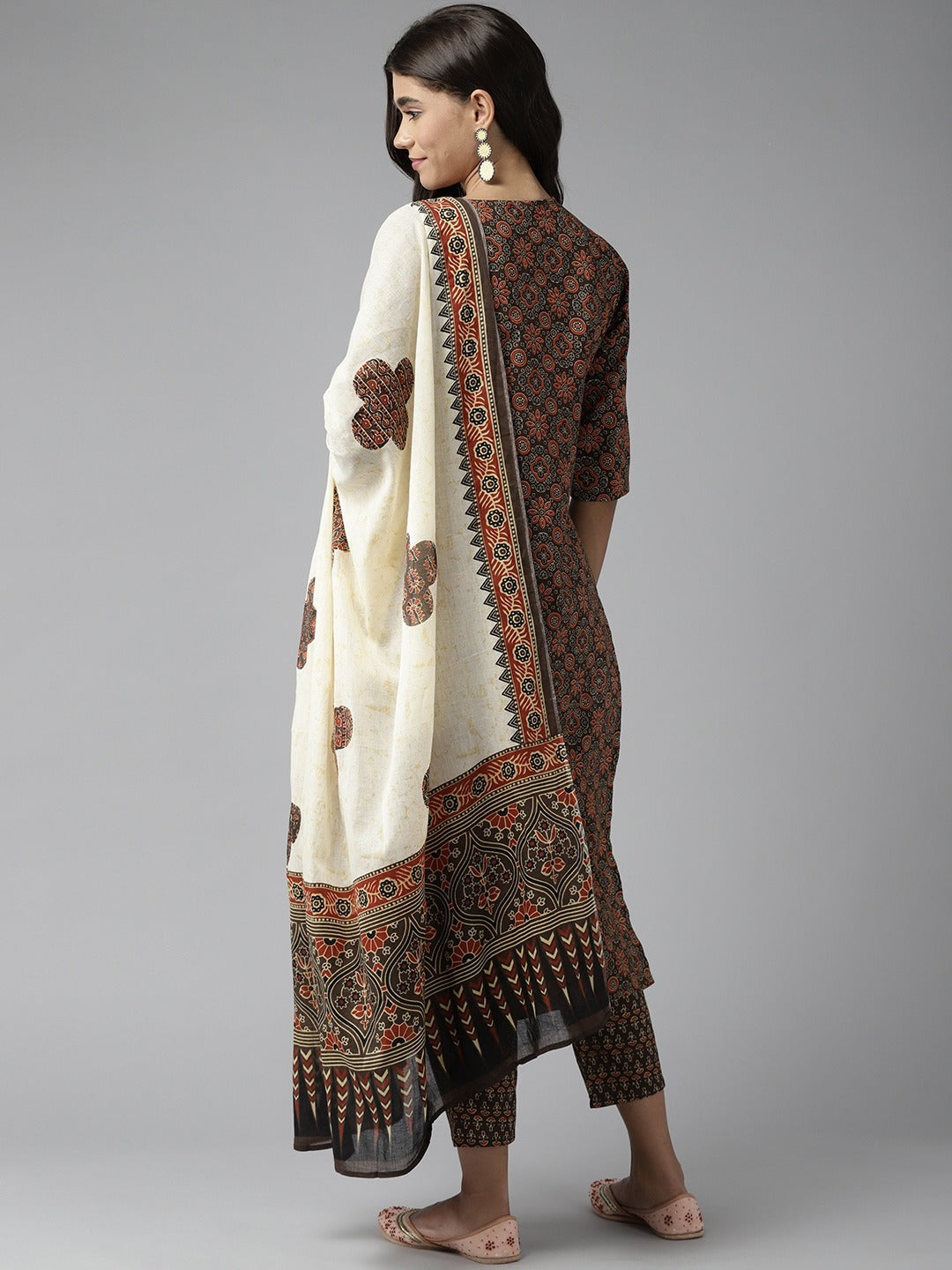 Ebbani Women’s Cotton Printed Brown Kurta Set with Dupatta