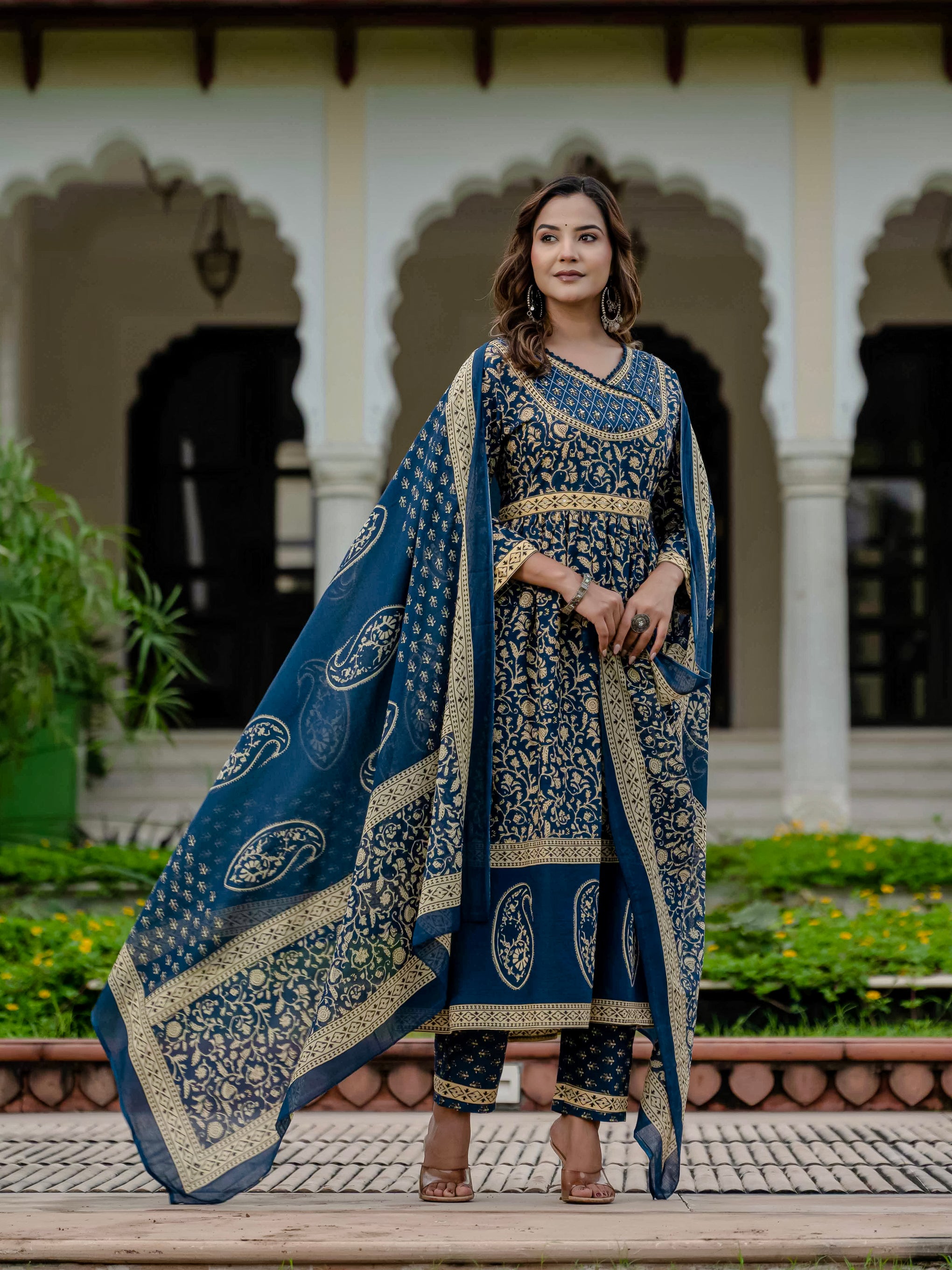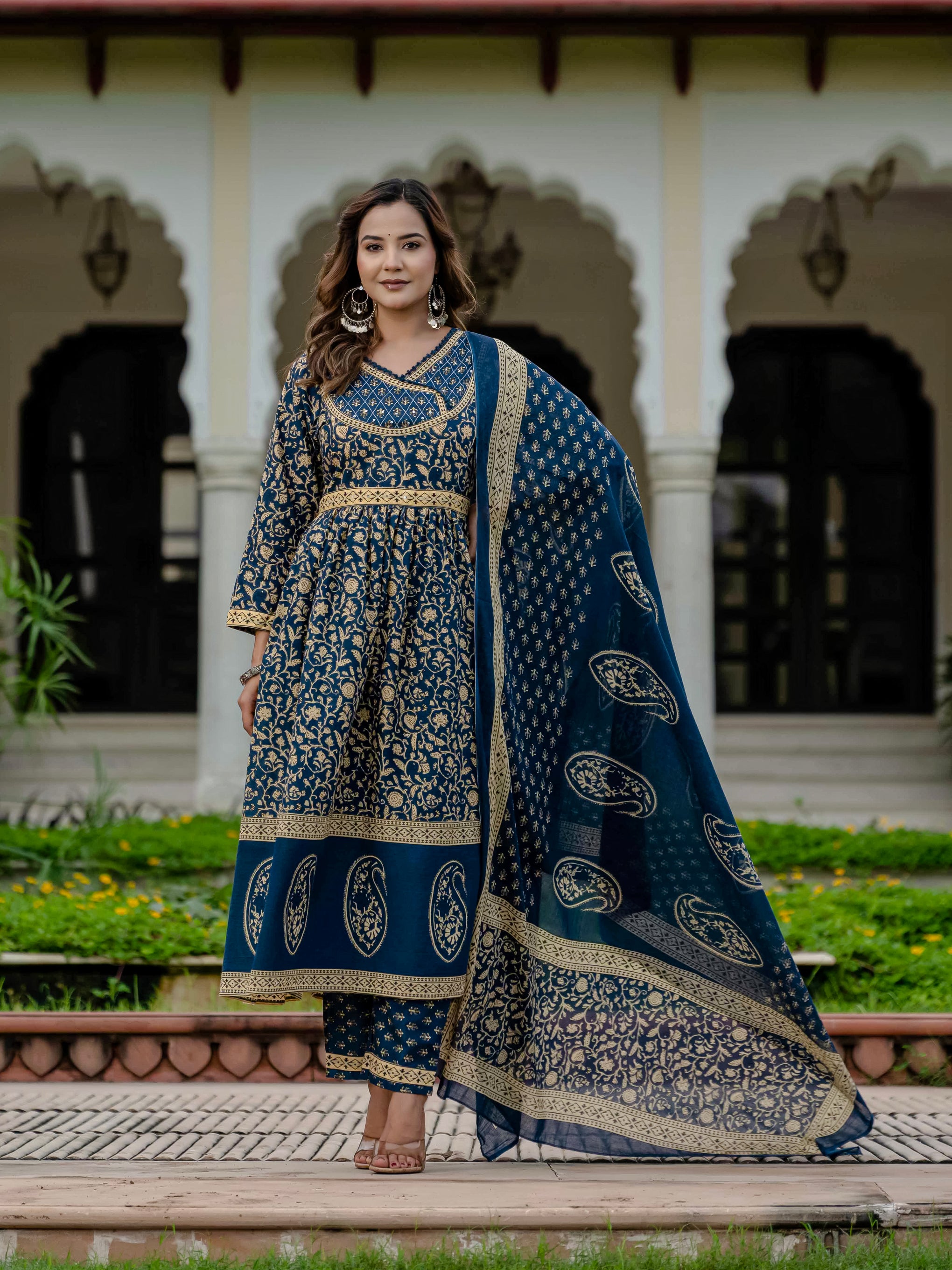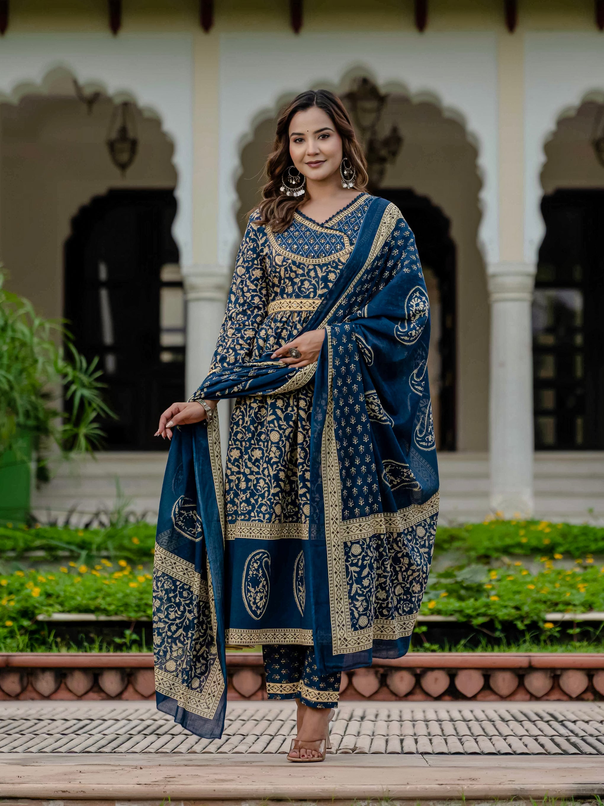 Ebbani Women’s Pure Cotton Ethnic Blue Printed Kurta Set with Pants & Dupatta