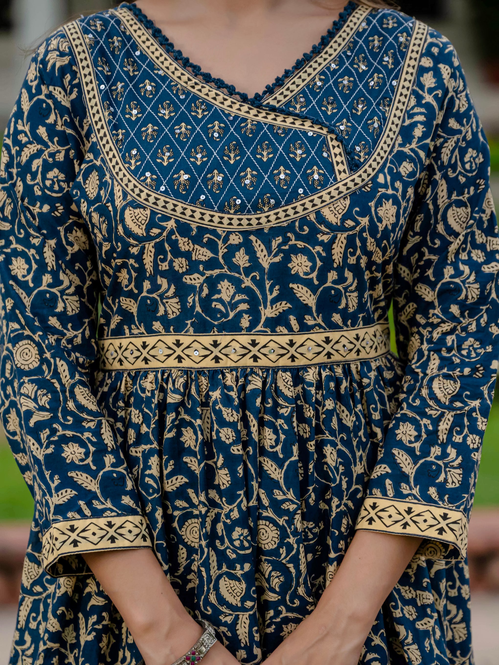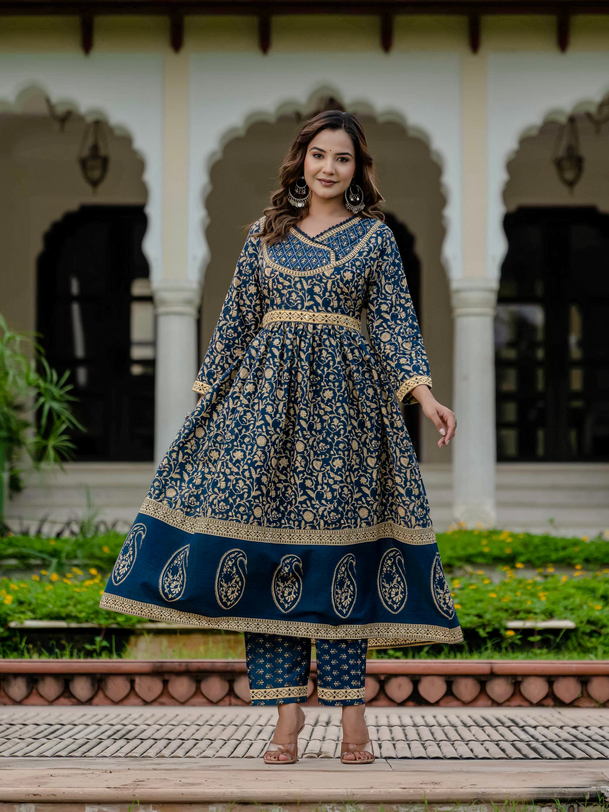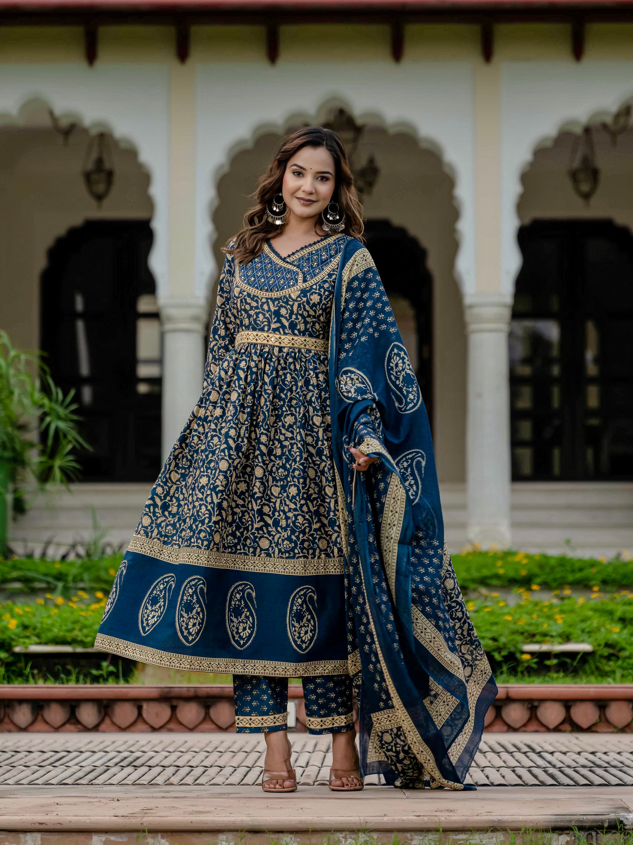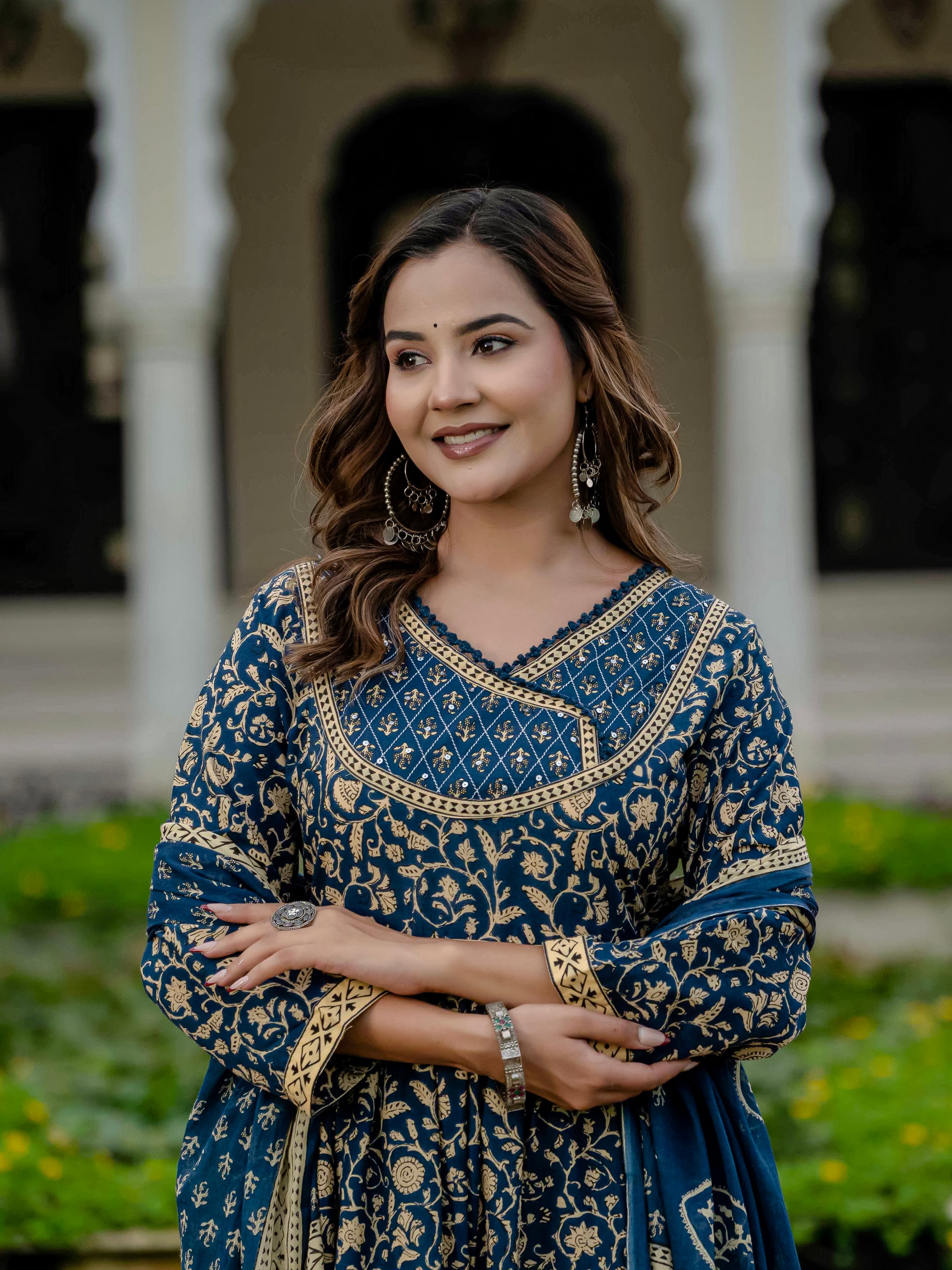 Ebbani Women’s Pure Cotton Ethnic Blue Printed Kurta Set with Pants & Dupatta