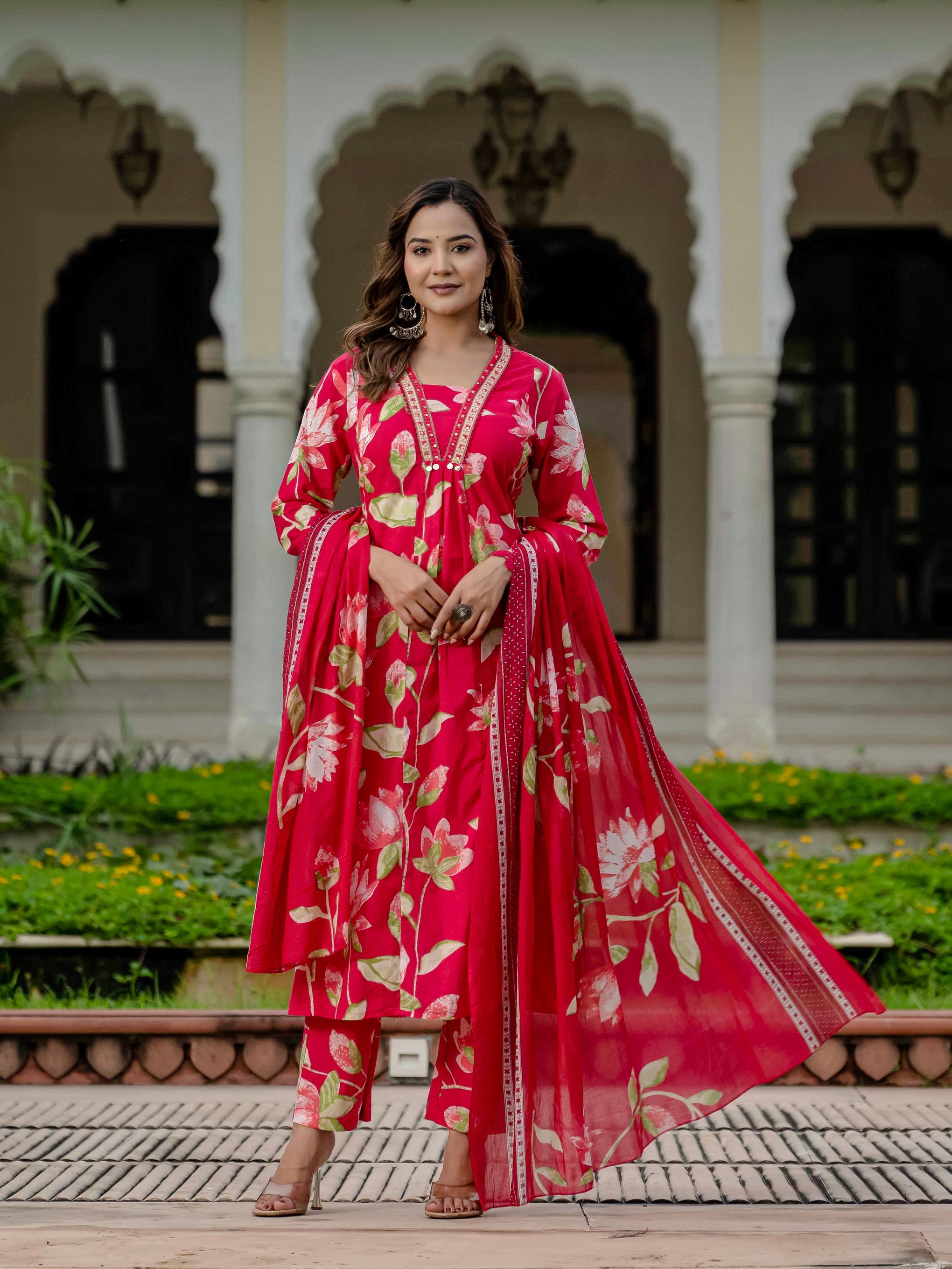 Featuring Beautiful Premium Cotton Aline Suits in three beautiful shades. It is crafted with finest floral prints all-over and delicate details over neckline and sleeves. It is paired with matching palazzo pants and dupatta which is highlighted with tassels. It has pockets.