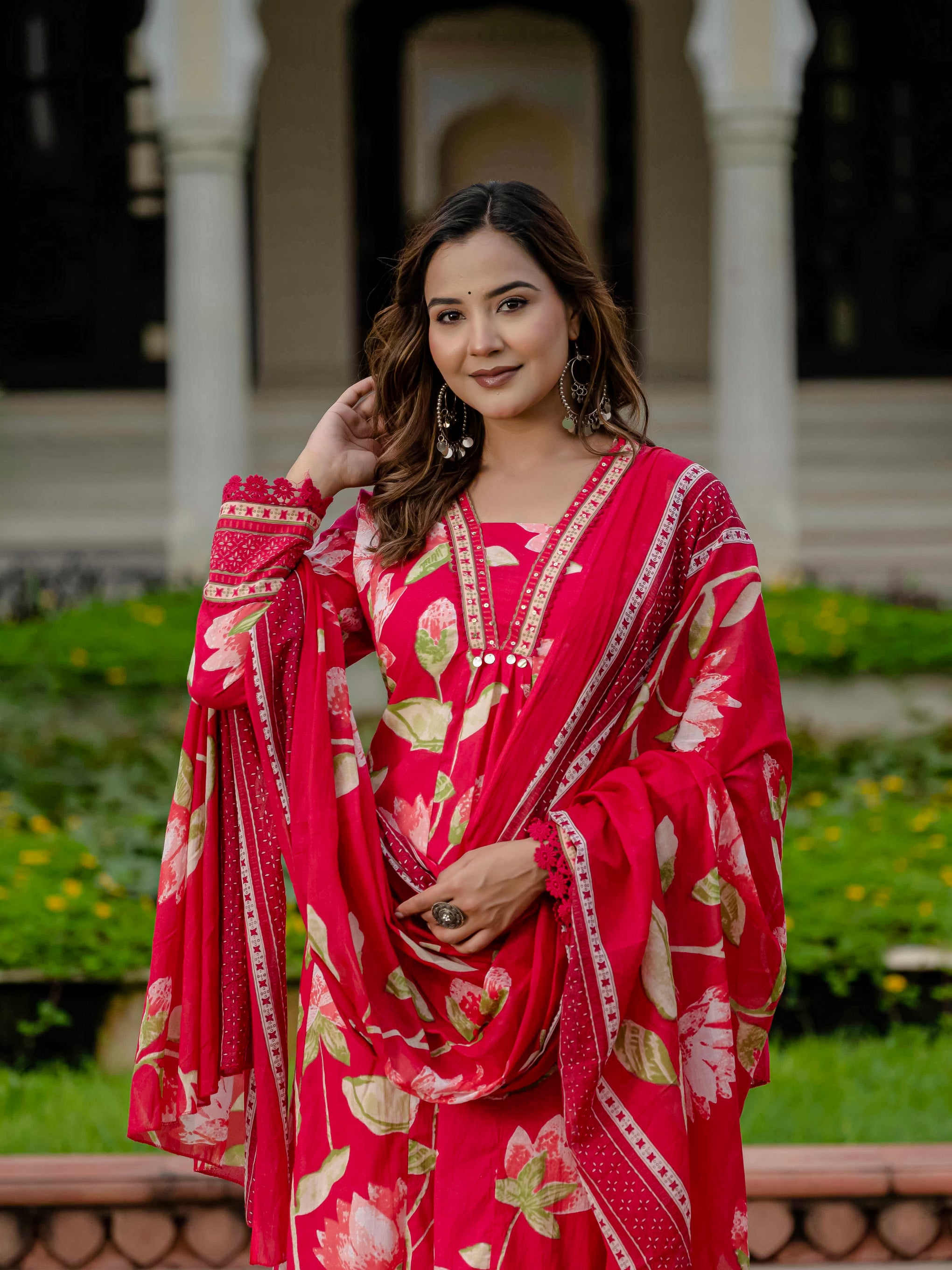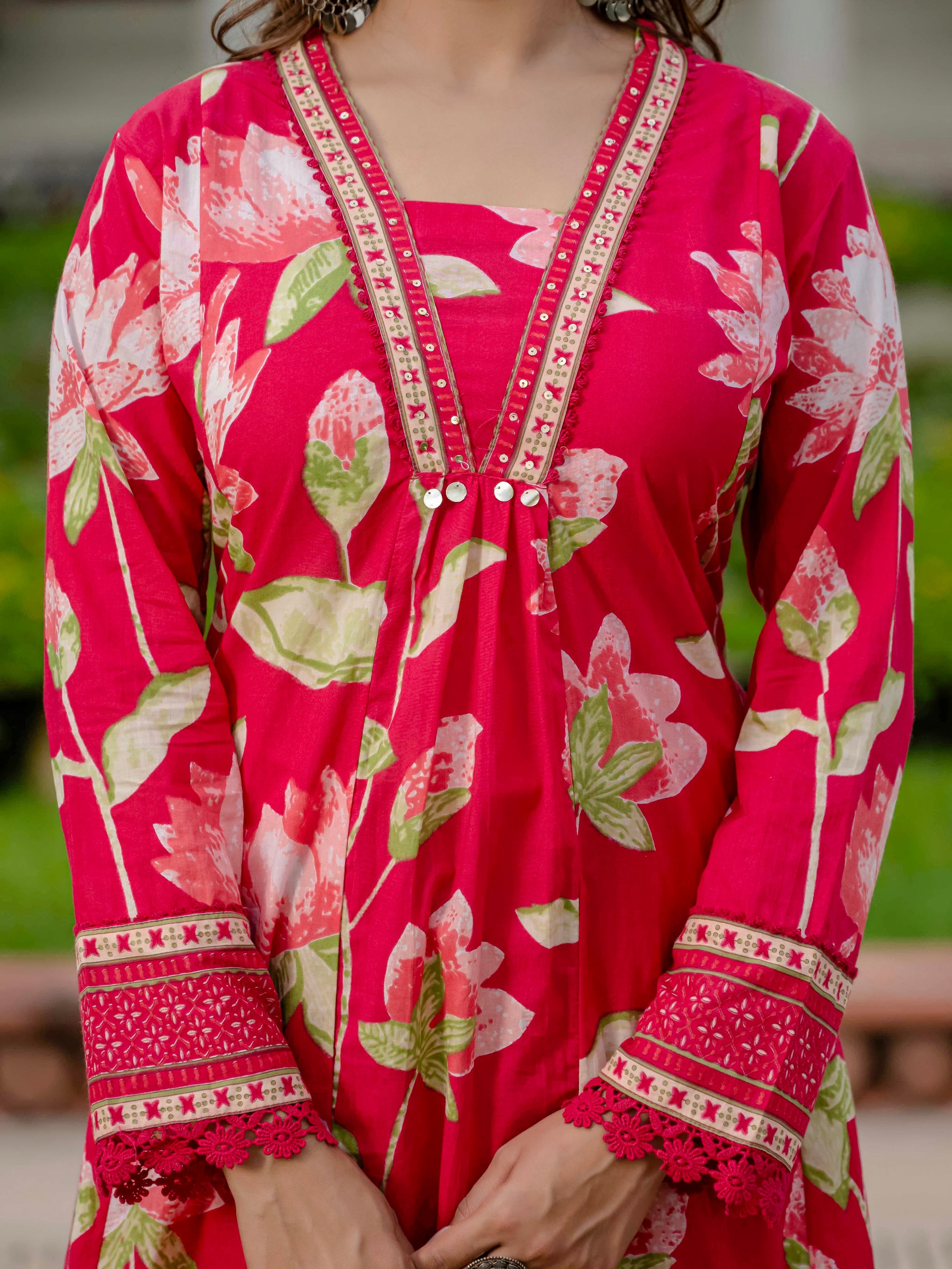 Ebbani Women’s Pure Cotton Pink Floral Kurta Set with Pants & Dupatta
